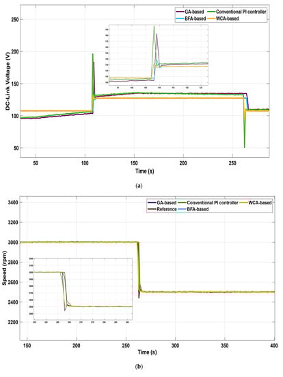 (a) DC-link voltage. (b) speed, and (c) battery current (Tracking responses under a constant rotor speed with the optimization techniques).