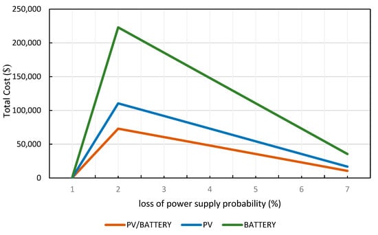 Sensitivity analysis is a valuable technique used to assess the behavior and performance of a control and optimization power supply system. Sensitivity analysis helps us understand the impact of changes in various parameters on a system’s outputs, such as its efficiency, stability, and cost. It can be observed how these parameters influence the system’s performance by systematically varying these parameters within predefined ranges. Different power supply loss probability values of 0–7% were obtained. A sensitivity analysis of the reliability of these three different configurations in a water pump system is given in Figure 10. As shown in this figure, increasing system reliability (reducing the amount of loss of power supply probability) leads to an increase in Total Cost. The results of this study were more economical when a solar–battery hybrid system energy was used in the water pumping system compared to other configurations. Therefore, the priority in building water pumping systems under actual conditions is to establish a solar power plant.