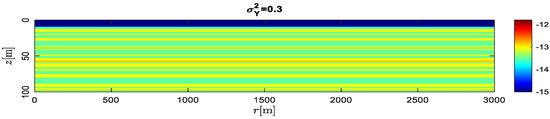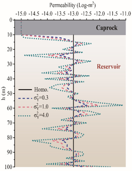 The multilayered formation system is initially saturated with the brine in a hydrostatic state, and the top and bottom boundaries are impermeable boundaries. The liquid pressure at the right boundary increases downward with a vertical gradient. Schematic of the simulation setup is shown in Figure 3. Logarithm permeability distributions of the reservoir beneath the caprock with three different variances are illustrated in Figure 4. The specified values of logarithm permeability distributions along the reservoir depth are shown in Figure 5. The larger the variance is, the more heterogeneous the multilayered formation is. The parameters listed in adopted for GCS are illustrated in Table 2.