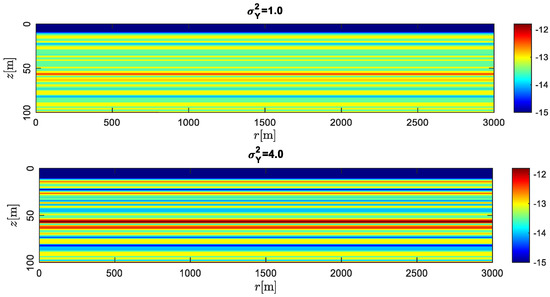 Logarithm permeability distributions of the stratified reservoir with different variances.
