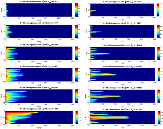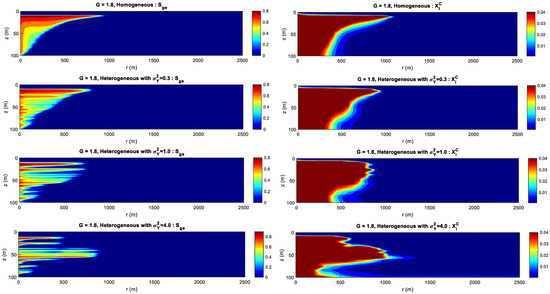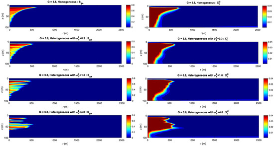 Figure 7, Figure 8 and Figure 9 show the spatial distribution of the effective saturation () and mass fraction of aqueous CO2 in brine () at the end of the injection (). The influences of heterogeneity and gravity index on CO2 migration are compared for the simulated cases.