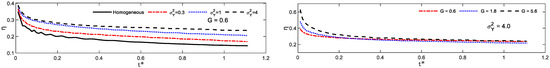 Figure 10 shows the temporal evolution of CO2 dissolution efficiency in brine during , and the effects of gravity index and heterogeneity on CO2 dissolution efficiency are investigated. It can be observed from the first column in Figure 10 that the gravity index has a prominent influence on CO2 dissolution efficiency. The higher the gravity index, the more CO2 is dissolved in brine. CO2 is more likely to dissolve in brines at a lower injection rate. For homogenous formation, the CO2 dissolution efficiency is lower than that of the heterogeneous stratum at the same gravity index and the permeability heterogeneity is more conducive to CO2 dissolution. When the gravity index is relatively bigger such as , the formation is gravity controlled and the influence of permeability heterogeneity on CO2 dissolution efficiency is not obvious. For bigger and medium gravity indices (), the CO2 dissolution efficiency increases with the increase of heterogeneity coefficient , and tends to achieve a stable value. As seen from in Figure 10, with the increase of the heterogeneity coefficient , the curve of CO2 dissolution efficiency is also gradually increasing at the same time. The second column in Figure 10 shows that the permeability heterogeneity is the decisive factor in determining the finial CO2 dissolution efficiency. The dissolution curve shows a decreasing trend during CO2 injection. During the initial injection period, the dissolution curve with the higher gravity index is relatively higher, and then the gaps between these curves become smaller and smaller, approaching a constant value. It should be noted that the CO2 dissolution efficiency curve with the maximum gravity index () is slightly higher for CO2 injection processes.