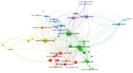 Relationships among electricity demand, machine learning, forecasting, peak load, and peak demand with the co-occurrence of literature review graphs.