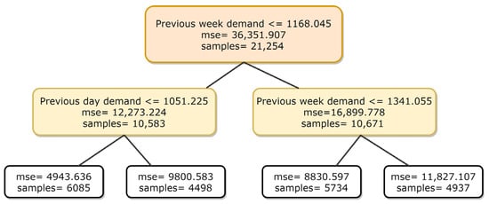 Random forest (RF) is a popular machine learning model that is used extensively for classification and regression tasks. RF consists of an ensemble model that combines multiple decision trees, known as classifiers or estimators. Each decision tree is trained on a random subset of n samples of the training data set, using a bagging technique. In bagging, a decision tree can be trained more than once using the same sample. RF also involves feature sampling, where only some input features are selected to split the trees at each decision node successively. Therefore, only some of the training set’s features (m < M) are used as predictors. This process ensures that the trees are slightly correlated with one another. Finally, the average of all the predictions of the decision trees is calculated, resulting in the final output. Figure 4 demonstrates the first decision tree node of the RF model that has been proposed for predicting hourly electricity demand, with a maximum depth of 2. As observed, the electricity demand from the previous week was determined to be the most important feature to split the first decision node.
