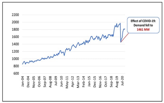 In addition, monthly data on peak demand were collected between 2004 and 2020, as shown in Figure 6. The COVID-19 pandemic had a significant impact on Panama’s electricity system. As did many other countries, the government of the Republic of Panama declared a state of emergency. In addition, it implemented extensive travel restrictions, beginning on 16 March 2020, closing the republic’s borders to other countries and prohibiting the entry of foreigners as a mitigation strategy against the pandemic. Many businesses and offices had to shut down due to the quarantine measures in place, forcing consumers to work from home. As a result, the lowest demand reported was 1461 MW in April 2020. However, electricity demand is now increasing as businesses return to normality.