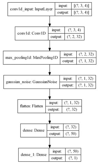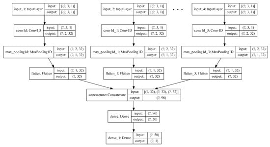 The multichannel CNN consists of one main model that processes each input feature as a separate channel while retaining the relevant information from all the features extracted into one feature map. The CNN starts with a convolutional layer that generates several feature maps. Next, a max-pooling layer reduces the feature maps’ dimensions. Then, a flattened layer outputs the information as a vector, which is then passed through a dense layer. Figure 8 shows the plotted graph for the multichannel CNN model. As can be observed, the model starts with a convolutional layer with the input shape (3, 4), which means that the model receives three previous time steps consisting of four input features.