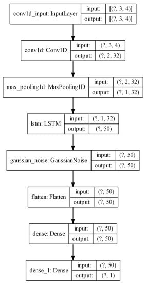 The first layer of the CNN-LSTM model consists of a convolutional layer that applies 32 filters to extract those features related to peak demand. A max-pooling layer is then applied to downsize the feature maps. Finally, the features extracted are further transformed by an LSTM layer, which models the sequential patterns. Figure 9 shows the sequential plot graph of the CNN-LSTM.