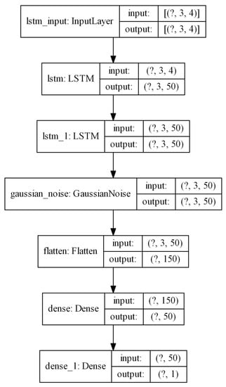 The final model consists of two LSTM layers comprising 50 hidden units each, which will process the data to learn the sequential patterns. First, the model receives an input shape (3, 4) similar to that of the CNN models. Then, the transformed data are passed through the LSTM layers, as shown in Figure 11.