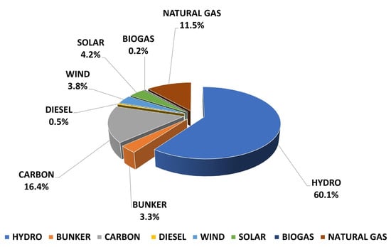Panama has invested in providing significant generation capacity to meet peak demand, as part of the country’s long-term expansion plan. Electricity demand is met using a diversified energy mix that includes hydro, thermal, and renewable power plants, as shown in Figure 5. As of 2019, the generation capacity currently installed is around 4000 MW, which exceeds the peak demand by far. Therefore, Panama’s power system has high flexibility to meet electricity demand, especially during critical periods. According to experts from the transmission company, the probability of an energy deficit is very low; therefore, current projections do not foresee energy shortages. However, only some of the demand at peak times is supplied with renewable sources since the participation of thermal generators is required, which have higher operating costs than are seen for renewables. Therefore, experts believe that demand will move closer to the installed generation capacity by around 2030–2034.