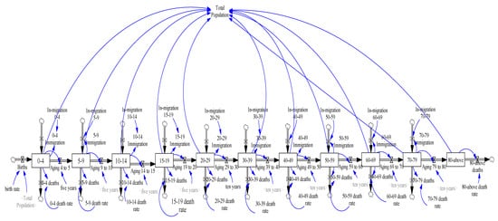 Population growth is essential for modeling the growth of energy consumption. Many countries are becoming more densely populated and need to be more effective at implementing energy efficiency measures, leading to higher energy consumption. According to the US Energy Information Administration, global energy consumption is rising faster than population due to a possible shift in the economy and the consumer adoption of more energy-intensive appliances. System dynamics has been widely used to model population dynamics. These models include the fertility rate and immigration to reproduce population growth more accurately. Ali et al. [40] used a system dynamics approach to analyze the impact of population growth on the residential housing market in the US. They used a top-down approach to model population growth, based on birth, migration, and death rates. This study’s population model was divided into different age groups of 0–4, 5–9, 10–14, 15–19, etc., which are represented as stocks, as shown in Figure 14. Data from the National Institute of Statistics and the Census of Panama were used to build the model. The National Institute of Statistics and the Census present estimates and projections for population growth that are sorted according to the different age groups in Panama. Therefore, population data for 2005 were used as initial values for the stock levels. The aging chain begins with the accumulation of births per year in the 0–4 age group. Then, the age 4 group matures and flows into the next age group, 5–9. The aging chain continues until the last age group, 80 and above. Therefore, the population changes, based on the birth rate and death rate. The population model has 34 differential equations.