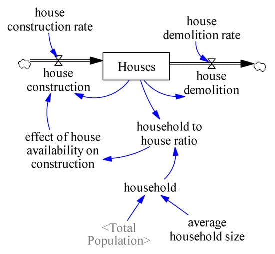 The next step consists of modeling the housing growth for Panama. This model is adopted from Forrester’s urban dynamics model, wherein he attempts to simulate the main internal forces that affect a city’s growth, based on its employment level, population, and business growth dynamics. The urban dynamics model presents a more complex structure regarding how house construction is mainly affected by the region’s attractiveness, land availability, and housing availability. However, our model only considers some of these factors. Figure 15 presents the system dynamics model for housing growth. The variable “Houses” is modeled as a stock that changes based on house construction. Therefore, it has a reinforcing feedback loop that indicates the building of more houses when needed. House construction is affected by two main variables: the house construction rate and house availability after construction. Therefore, more houses being available means that house construction will slow down.