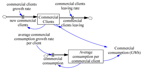 Figure 16 provides an example of the stock-flow diagram for the commercial sector. It can be seen that the total energy consumed by the commercial sector will increase, based on the growth of the stocks labeled “commercial clients” and the “average consumption per commercial client”.