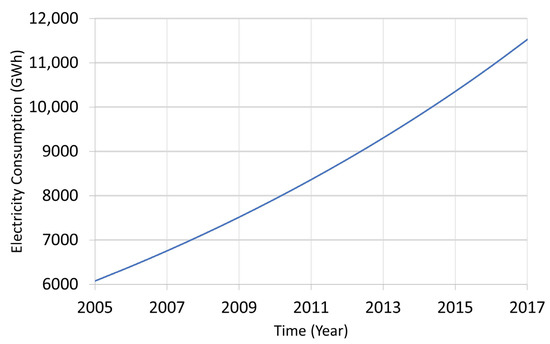 Figure 17 demonstrates the initial electricity consumption curve reproduced for the period from 2005 to 2017, in which electricity consumption increased from 6073.85 GWh to 10,684.8 GWh.