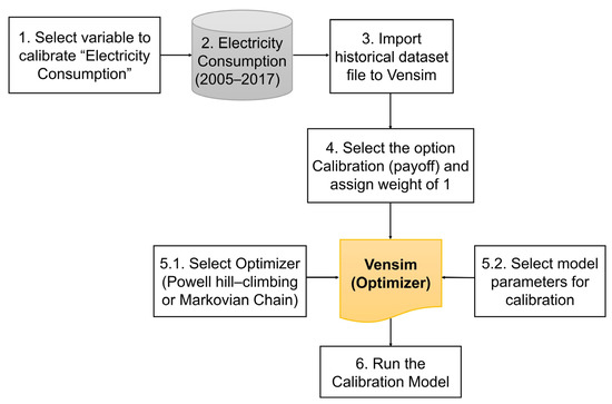 Once the model was structurally complete and it simulated the system correctly, we proceeded to calibrate the model. Calibration is the most important step for validating the integrity of a system dynamics model. Calibration is an optimization process that identifies the optimal parameters that best fit the historical data curve. The first step was to select the variable to be calibrated, “Electricity Consumption”. Therefore, data on electricity consumption were collected from 2005 to 2017 from the National Secretary of Energy of Panama to help the model to fit the historical data better; the initial curve is reproduced in Figure 17. Figure 18 shows a flowchart of the calibration process.