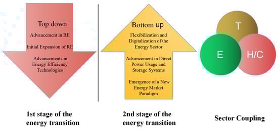 Building upon the foundation laid by its predecessor, the second stage of the energy transition represents a progressive stage characterized by the integration of energy systems, emphasizing sector coupling (SC). The importance of SC in the German energy transition cannot be overstated. Definitions of SC vary, ranging from considering the one-way path of electricity from the power sector to end-consumption sectors, to encompassing cross-energy-carrier integration, including excess heat utilization and biomass energy [3,4,5,6]. In this paper, SC is defined as the profound integration of significant energy consumption sectors, including electricity, heating/cooling, and transportation, fostering a synergistic relationship. This concept aligns with the United Nations Sustainable Development Goal (SDG) 7 (Affordable and Clean Energy), as it emphasizes the integration of different energy sectors to optimize energy consumption and promote the use of clean and affordable energy sources. SC also drives innovation in infrastructure and energy systems, fostering sustainable industrial development (SDG 9: Industry, Innovation, and Infrastructure). The integrated approach described aligns with SDG 11 (Sustainable Cities and Communities), enabling the development of smart, sustainable urban areas. Additionally, SC contributes to SDG 13 (Climate Action) by facilitating the integration of renewable energy sources and the electrification of various sectors [7]. It is important to acknowledge that in the SC’s definition, electricity is not solely generated from renewable resources. The authors argue that a complete elimination of nuclear and coal power may not be a desirable approach, primarily due to the need for flexibility in the energy system. By maintaining a diverse energy mix that includes a limited amount of nuclear and coal power, a stable electricity supply can be ensured during periods of low renewable energy generation or unexpected situations.