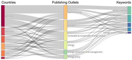 A three-fields-plot of countries, publishing outlets, and keywords most relevant to sector coupling technologies and models.