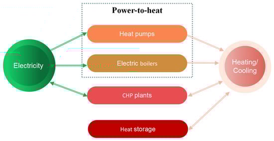 Power-to-heat involves the transformation of electricity to heat. This technology is utilized by both electric boilers (EBs) and heat pumps (HPs), as shown in Figure 3. Many household appliances, such as electric kettles and water heaters, also utilize the concept of P2H. Additionally, P2H is used for negative control energy supply, process heating, and district heating systems for water heating and space heating [17]. Conversely, the process of P2H conversion can also take the form of converting heat into electricity, such as by utilizing waste heat from gas-steam power plants [18]. In these cases, the waste heat generated during the gas power generation process is used to operate the steam power plant, which in turn converts the heat energy into electric energy.