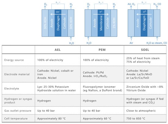 The first step in the electrolysis of water involves a reaction principle that is reasonably simple and requires fewer reaction conditions. There are now three primary types of electrolysis: alkaline electrolysis (AEL), polymer electrolyte membrane (PEM), and solid oxide electrolysis (SOEL). Their characteristics are shown in Figure 4.