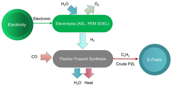 As shown in Figure 6, the production process of P2L consists of several key steps. Initially, an electrolyzer is employed to produce hydrogen, as specified in P2G Equation (2). Following this, the produced hydrogen is combined with CO2/CO. It is worth noting that CO2, which is typically a waste product of many industrial processes, plays a crucial role as a carbon source in P2L. Its integration with hydrogen facilitate the synthesis of hydrocarbons and their further conversion into specific end products. This approach effectively recycles CO2, turning it from waste into a valuable resource.