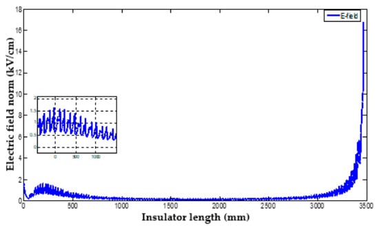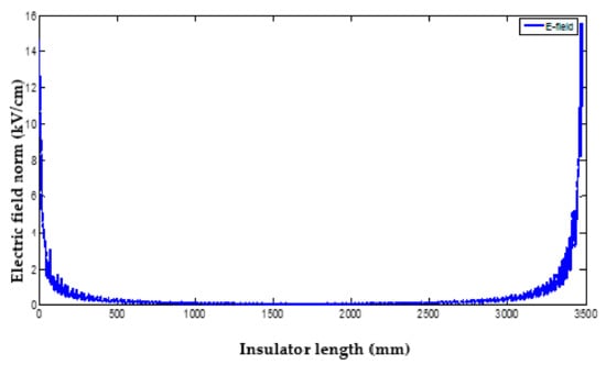 Electric field distribution along the insulator, under dry and clean conditions with an existing grading ring at the energized end.
