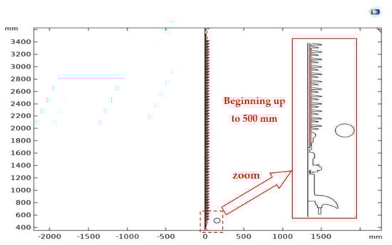The subsequent stage, referred to as the solving stage, involved assigning boundary conditions to each geometric element and implementing the mathematical model, typically represented by differential equations that describe the underlying physical phenomenon. Through simulation, a plot of the results was generated with respect to the varying variables or parameters. Given the axial symmetry of the insulator, the analysis focused on half of the insulator model, as depicted in Figure 4, as it adequately represented the behavior of the entire structure.