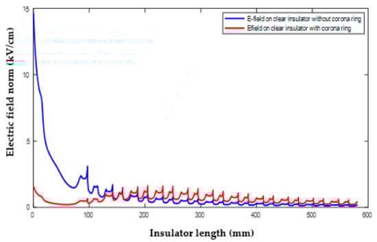 Comparison of the electric field along the insulator with and without a ring.