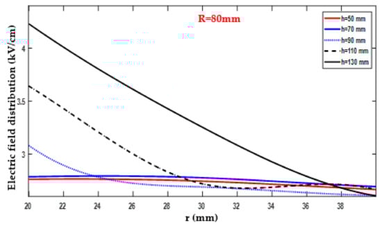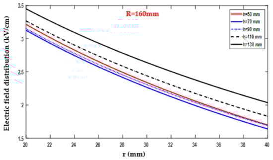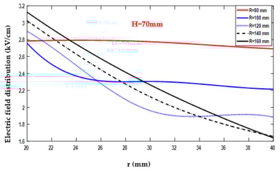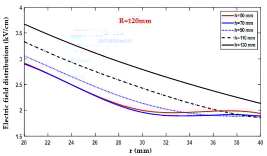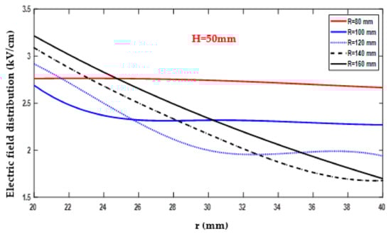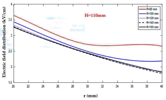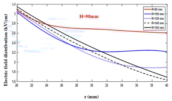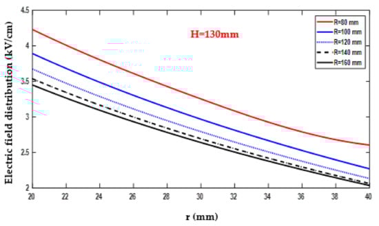 Conversely, the minimum electric field value recorded was 1.68 kV/cm, as indicated in Figure 17 and documented in Table A6. This minimum value was obtained with R = 140 mm, r = 40 mm, and H = 50 mm. The data collected in Table A6 provide detailed information on the variation of the electric field as R changed within the range of 80–160 mm, while H 15 remained fixed at 50 mm.