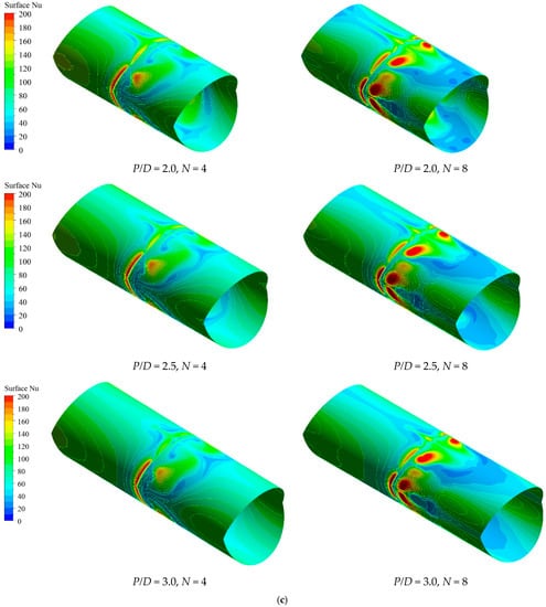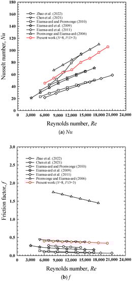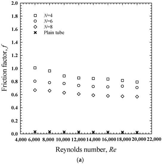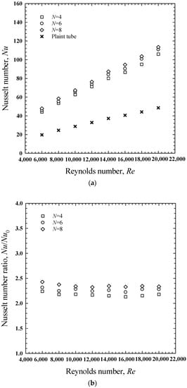 - The heat transfer rates were around 2.4% to 9.3% higher for N = 8 compared to N = 4 and N = 6, while N = 4 caused the maximum friction factor that was, respectively, 12.2–25.6% and 39.4–50.9% higher for N = 6 and 8.