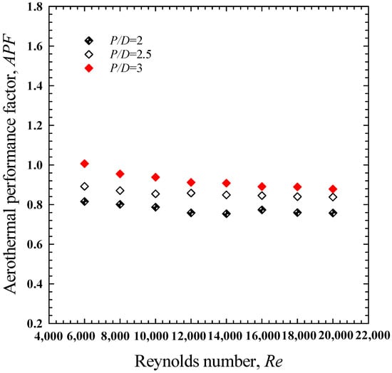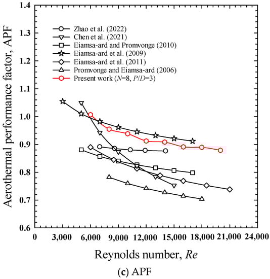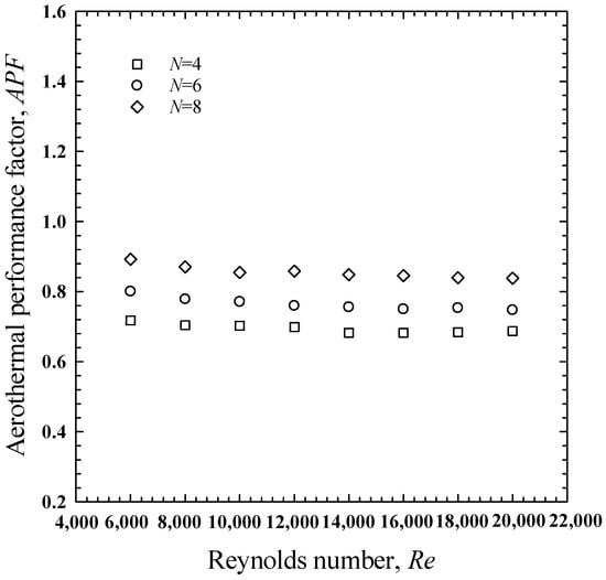 - For the baffles with N = 4, 6, and 8, the aerothermal performance factor (APF) ranged between 0.68 and 0.71, 0.75 and 0.78, and 0.84 and 0.87, respectively. Adoption of V-shaped wing baffles resulted in aerothermal performance factors (APFs) beyond unity in the low Reynolds number range (Re ≤ 6000).