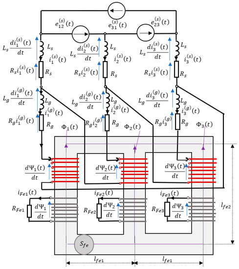 In the considered case, the windings of the primary side of the three-phase transformer were delta-connected. The flux linkages were chosen as the state variables in the magnetic circuit equations.