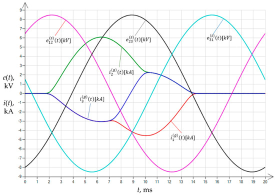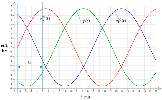 Functions (11), representing input phase-to-phase voltages at the terminals of the primary winding of an unloaded transformer, met the requirements of the construction of Equations of states (5) and (8). The parameter present in the formula made it possible to define the time instant specified in the voltage waveform at which the indicated voltage appeared at the given transformer winding.