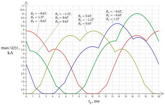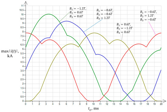 A comparison of the results of the calculations presented in Figure 5 and Figure 6 showed that for the pre-magnetization scenario in the center column with a value twice that of the outermost columns (this refers to the absolute value), the distributions of maximum currents do not depend on the phase sequence.