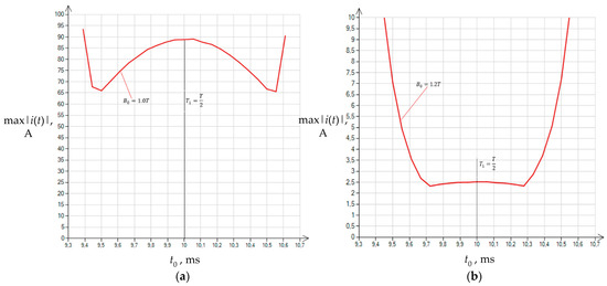 The influence of the time instant determined in the waveform of the supply voltage applied to the transformer was investigated by changing the parameter in functions (11) applied then to the equations of states (5) and (8).