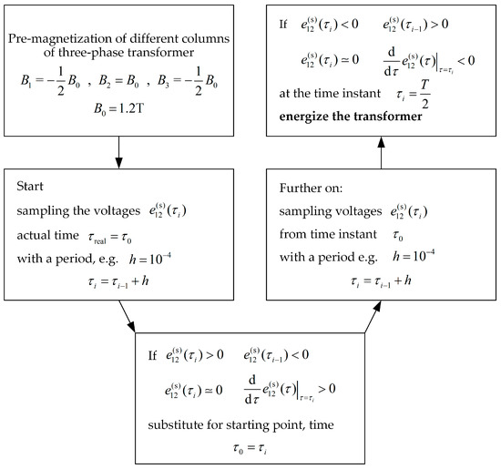 Figure 4 shows the flowchart of the algorithm applied in both tests. The algorithm was input into the authors’ own C# software [30]. The program allows the precise calculation and visualization of the distributions of the maximum values of the inrush currents of an unloaded transformer depending on the time instant characterizing the time instant in the waveform of the switched supply voltage and also the values and initial scenarios of the pre-magnetization of transformer’s different columns. To integrate the stiff differential Equations (5) and (8) of the transformer model, the authors’ own ninth-order Radau IIA method was used [31,32,33].