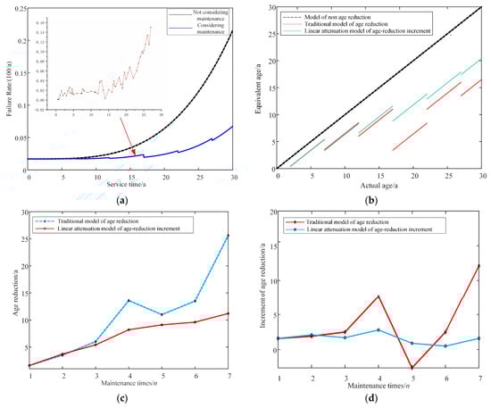 Figure 4c depicts the increase in the service age setback with the number of overhauls for the new model as the number of equipment overhauls increases. However, the trend is slow and finally reaches the maximum number of overhauls tends to be constant. The service age regression increment decreases for the same type of overhaul and the increase occurs when a major overhaul is performed in that year. The incremental amount of setbacks increases relative to minor overhauls, but the overall trend is still decreasing. Therefore, the service age model with linear decay characteristics established in this paper is consistent with the actual equipment failure situation.