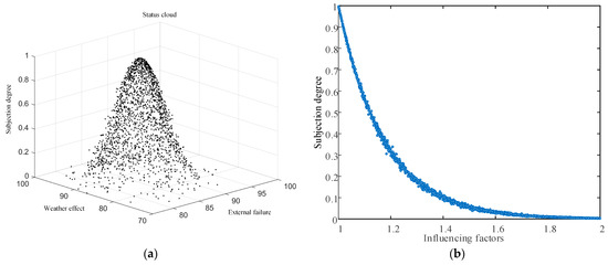 Figure 5a. It can be seen that the two-dimensional initial cloud can better describe the uncertainty and probability distribution characteristics of the original cloud droplet. The entropy of the cloud model is calculated according to the expression of the expectation equation of Γ cloud and the super entropy is chosen as 0.05. The affiliation obtained from the two-dimensional state cloud is used as input to obtain the one-dimensional influence factor cloud.