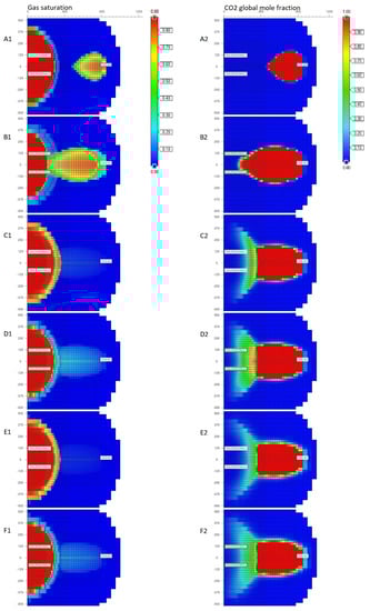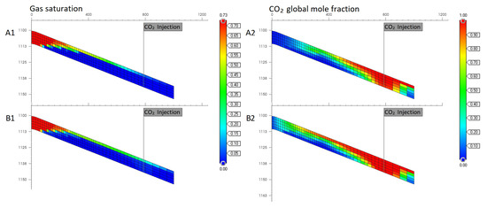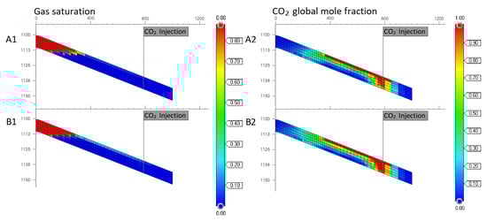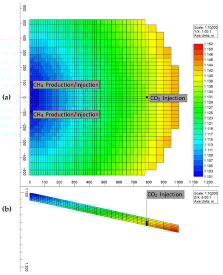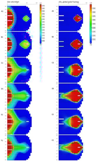 Before the first production cycle, the injected did not reach the methane area in either case. In the aerial view of model with higher , the gas-saturated area in place of injection was wider than that in model with lower permeability. This was due to higher vertical permeability, which caused faster movement of from lower layers. After the first production cycle in the case of the m model, still did not reach the methane area, in contrast to m, at which reached methane, but the aerial view of the fraction indicated that mixing did not start.