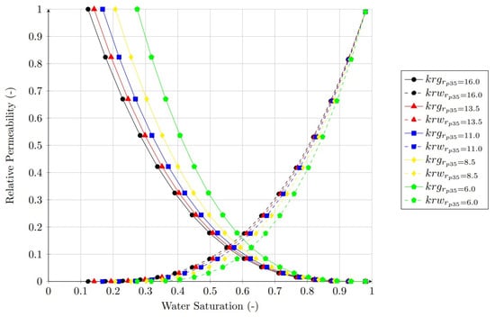 Having the same porosity, models with different pore structures differed with respect to permeability, covering the range from 121 mD to 1073 mD. Moreover, the resulting differences in initial water saturation and thus in the pore volume available to natural gas (and/or carbon dioxide) were incorporated. These differences affected the models’ pressure behavior with regard to the average reservoir pressure and well bottom-hole pressure.