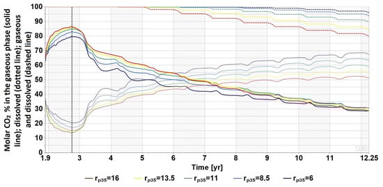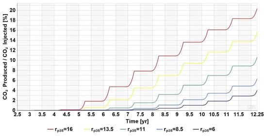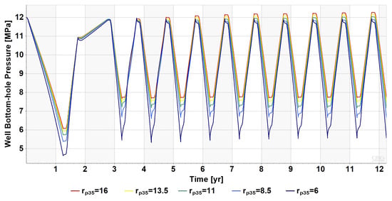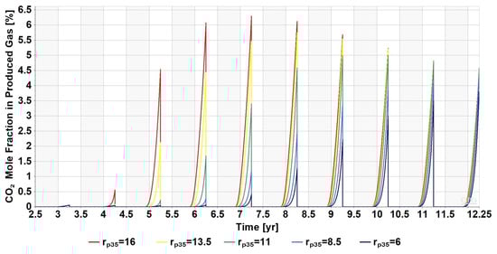 It was noticeable that the pressure when the storage was full increased with successive cycles. The largest growth (when comparing the pressure at the end of injection) was that in the m model, and the changes were smaller with lower (at r = 16 m, the model difference for 10 cycles equaled 0.35 Mpa; in the r = 6 m model, this was almost 0 MPa). This was due to the replacement of with , which is less compressible. The higher the depletion, the lower the compressibility of the system, and the higher the average pressure. This may partly explain the increasing differences described in the previous paragraph.