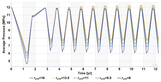 In all models, during the stabilization phase, the average pressure grew after the production phase and decreased after the injection phase. The difference was that the magnitude of this pressure growth/drop was dependent on . The highest magnitude of growth/drop was observed at m (121 mD) and was lower at higher . Higher (thus permeability) provided better flow from the aquifer to the model, which ensured faster pressure equalization.