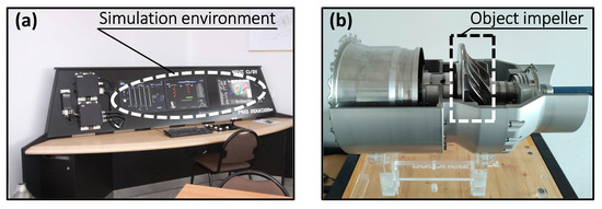 The investigation was carried out with the use of the WESTT CS/BV virtual test bench located at the Aerospace Engineering Department of Rzeszów University of Technology (Figure 1a). The test bench was a digital simulator of the DGEN 380 general aviation turbofan offered by Price-Induction SA (currently Akira Technologies [31]). Its hardware incorporates the full-scale performance data of the real engine and enables an execution of virtual manoeuvres with experimental-order accuracy as long as the regions of the flow transients (e.g., rotating stall, surge, etc.) are omitted [32].
