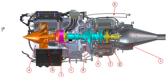 The cutaway illustration of the DGEN 380 [31] engine: (a) engine inlet, (b) fan, (c) gearbox, (d) high-pressure compressor, (e) combustion chamber, (f) high-pressure turbine, (g) low-pressure turbine, (h) fan nozzle, (i) core nozzle, and (j) stator.