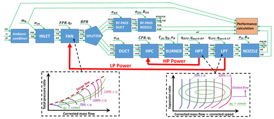 The model chart in Figure 3 also represents the flow of total temperature , total pressure , and mass flow rate across the system with indexation consistent with the engine’s section nomenclature in Figure 2. The global input parameters were the altitude H, engine (aircraft) flight speed (assumed as zero for take-off), and ambient temperature correction , which was omitted in this work. The parameters were utilised to derive the ambient conditions (, ) in accordance with the ISA standard and to initialise the model. The model then evaluated the performance of the individual components in a sequence illustrated in the flow-chart (green arrows), matched the power balances of the turbo components (red arrows), and ended at the “Performance calculation” module. The latter served to derive the engine thrust and specific fuel consumption :