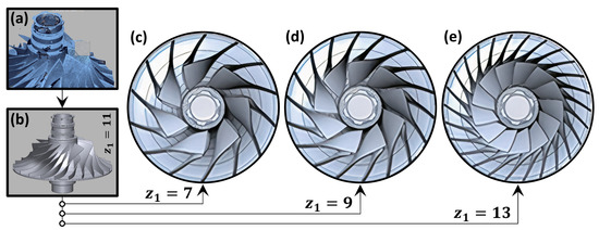 The 3D CAD model of the baseline HPC impeller (Figure 4b) was built by implementing a reversed-engineering procedure. An STL-model (Figure 4a) was initially acquired through 3D scanning (ATOS Core) and then converted into a solid in the Geomagic Design X 2020.0.2 software. Afterwards, the model was further processed to obtain alternative designs with , respectively (Figure 4c–e).