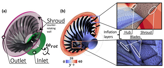 The solver selected for the implementation of the numerical part of the study was ANSYS CFX 22R2. Since the study focused primarily on the analysis of engine’s performance at the nominal design point, all governing equations were solved in a steady-state Reynolds-averaged fashion. The entire computational domain (Figure 5a) was solved in the rotating frame of reference with counter-rotating walls prescribed at stationary boundaries (whole shroud surface, hub end-wall surfaces upstream and downstream of the impeller’s blade cascade). Turbulence was modelled by the model with the intensity and length-scale specified at the inlet boundary.