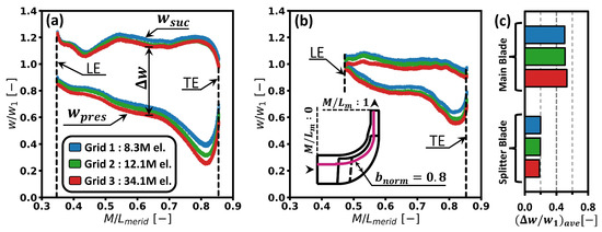 (a,b) Distributions of normalised relative flow velocities along the suction and pressure surfaces of the main (a) and splitter (b) blades as functions of the normalised meridional coordinate and computational grid resolution. The graphs were obtained from respective static pressure distributions at 80% of the blade span and under the assumption of zero flow viscosity [44]. (c) Integrally averaged blade-loading parameters computed for the main and splitter blades based on the charts (a,b), respectively.