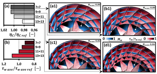 Influence of impeller’s blade number on the normalised isentropic compression efficiency / (a) and normalised average wall shear stress (b). (a1–d1) Contour plots of relative Mach number (blue legend) and normalised shear stress (red legend) from to , respectively.