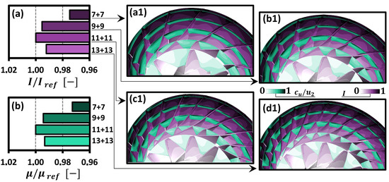 Since the impeller’s blade number would obviously not affect either or , the main task of this subsection was to focus on the way it influenced and I. To begin with, the numerically derived efficiencies were scaled so that the prediction for could match the reference value evaluated based on the virtual test data in Table 7. These results are plotted in Figure 7a and demonstrated the possibility of a 1% efficiency rise as the blade number was reduced to or 7. There was a rather more pronounced 2% drop of as the impeller solidity was raised to . The explanation of the flow physics underlying these trends could be based on the contour maps in Figure 7a1–d1, which illustrate the combined inlet-to-outlet distributions of the relative Mach number and normalised wall shear stress . The increase in obviously resulted in a higher overall friction area, higher contraction (blade metal blockage) at the inlet, and higher levels of . Besides, the level of averaged over the endwall and blades’ surfaces grew gradually from 0.92 at to 1.09 at (Figure 7b). According to [44], these trends should primarily contribute to the growth of the profile efficiency loss expressed as: