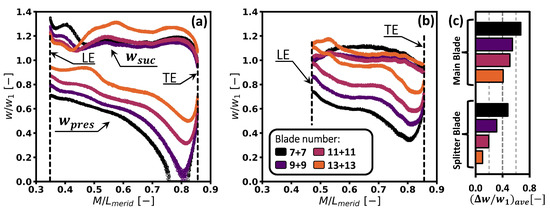 (a,b) Distributions of normalised relative flow velocities along the suction and pressure surfaces of the main (a) and splitter (b) blades as functions of the normalised meridional coordinate and impeller blade number . The graphs were obtained from the respective static pressure distributions at 80% of the blade span and under the assumption of zero flow viscosity [44]. (c) Integrally averaged blade loading parameters computed for the main and splitter blades based on the charts (a,b), respectively.