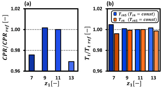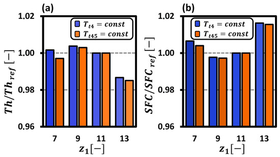 The implementation of the engine’s zero-D analytical model described in Section 2.2 required a single pre-processing step, namely the determination of the HPC’s total-to-total pressure ratio for each considered in the study. This was accomplished through the use of Equation (3). The values of and I were borrowed from the results of CFD modelling and scaled so that the baseline () could match the virtual-test-based value of 4.6. The results normalised by the reference baseline value are presented in Figure 10a. The effect of the blade number on the was minimal (0.2% growth) at and maximal (3.1% decline) at . The former was a consequence of the higher efficiency counter-balanced by the lower work input, whereas the latter was caused by the mutual efficiency and work input deficit, both explained in Section 3.3 (Figure 7a and Figure 8a).